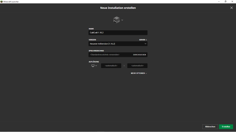Benenne nun dein Profil und lege deine Version fest. Entweder du wählst zum jetzigen Zeitpunkt die Neuste Vollversion oder release 1.16.5, letztere Auswahl ermöglicht dir auch das problemlose joinen auf dem Server wenn eine neuere Version veröffentlicht wird. Mit einem Klick auf Erstellen kannst du das Profil abspeichern und nun ganz normal starten.