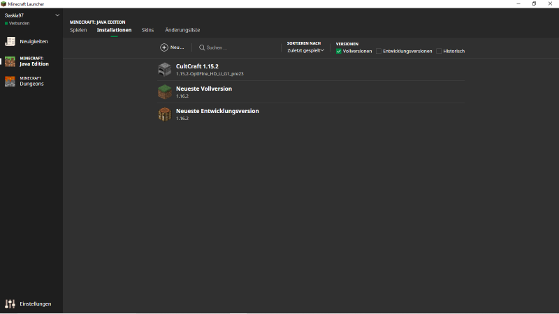 Du öffnest zuerst deinen Minecraft Launcher. Klicke nun auf den zweiten Tab Installationen im Launcher -