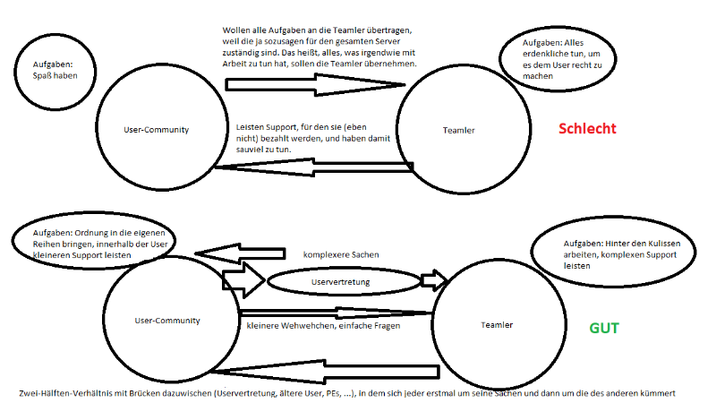 Genauso ist es mit den (neuen) Usern. Für sowas gibt es die User-Community. Die soll sich um ihre eigenen Mitglieder kümmern können, nicht immer alles auf die Teamler ausweichen lassen. (Siehe mein wunderhübsches Paint-Bild im Anhang.)