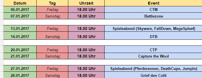 Evtl. Ein Vorschlag den Spieleabend af Freitag zu verschieben da meiner Meinung nach samstags mehr Leute für ein Größeres Event da sind.