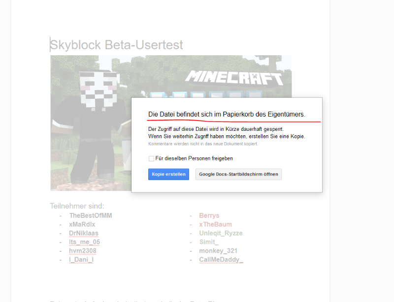 ich bin einer der Beta Tester von Skyblock. Ich wollte mich erkundigen wie es nun ausschaut. Nun bin ich erstmal ins offiziele Google Doc für die Beta Tester gegangen, um zuschauen ob sich nach einigen Monaten dort was getan hat. Also Antwort bekam ich dies: